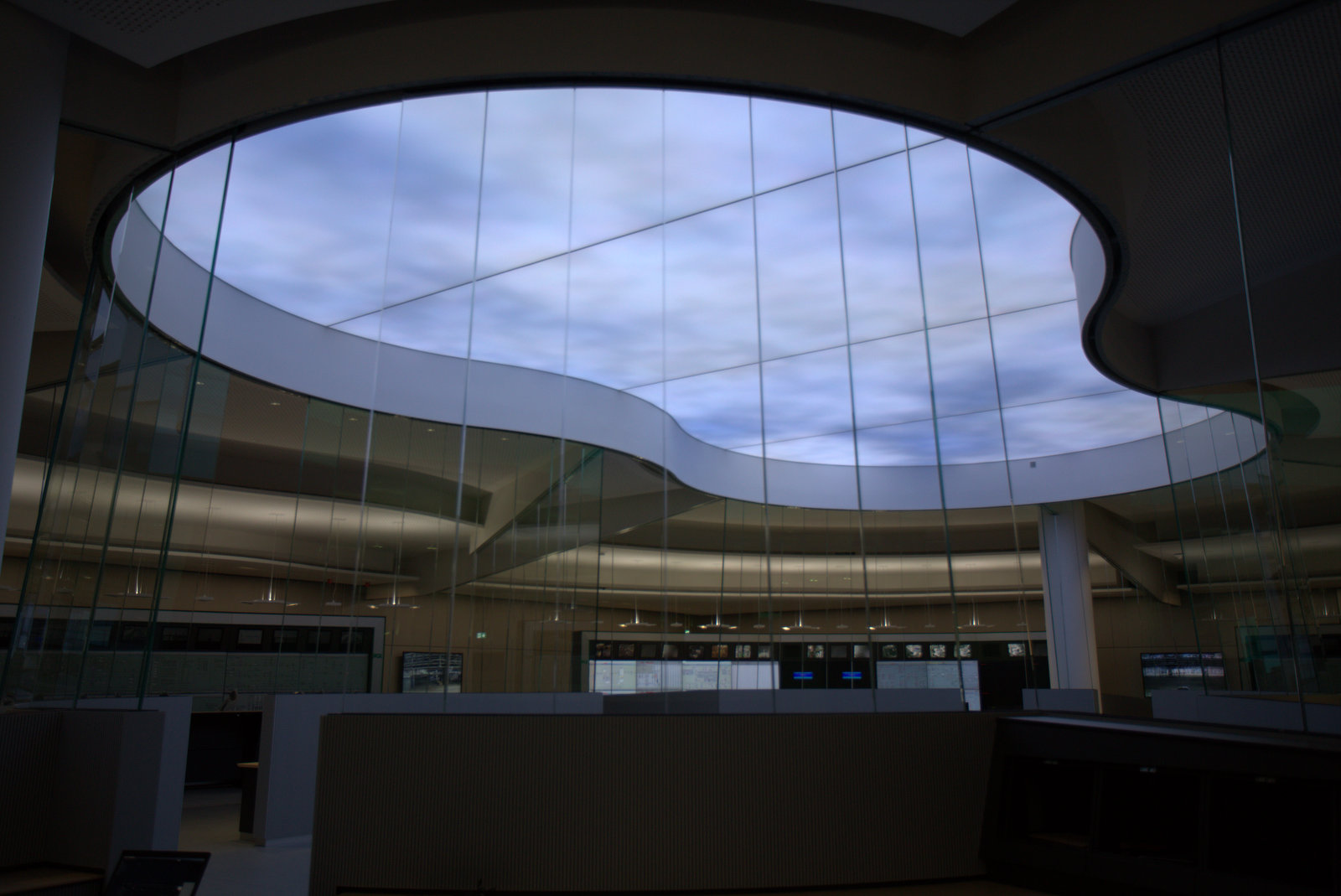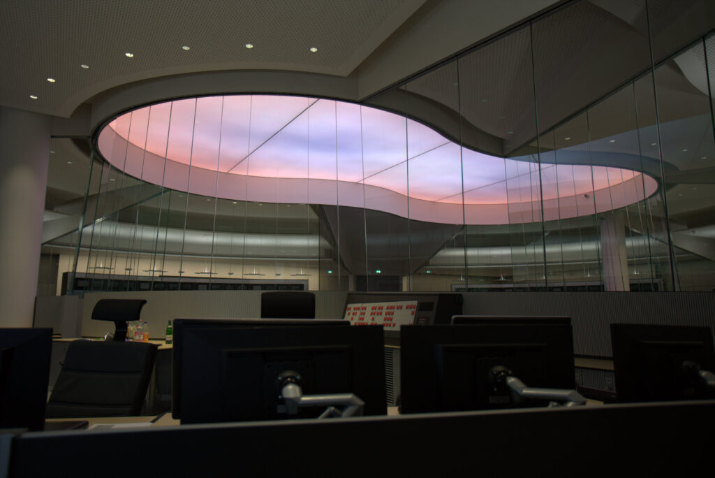 Zusätzlich zum Wolkenhimmel fliegen ab und zu Flugzeuge oder Vögel über die Lichtdecke, zu den Schichtwechseln gibt es thematische farbige Lichtstimmungen.