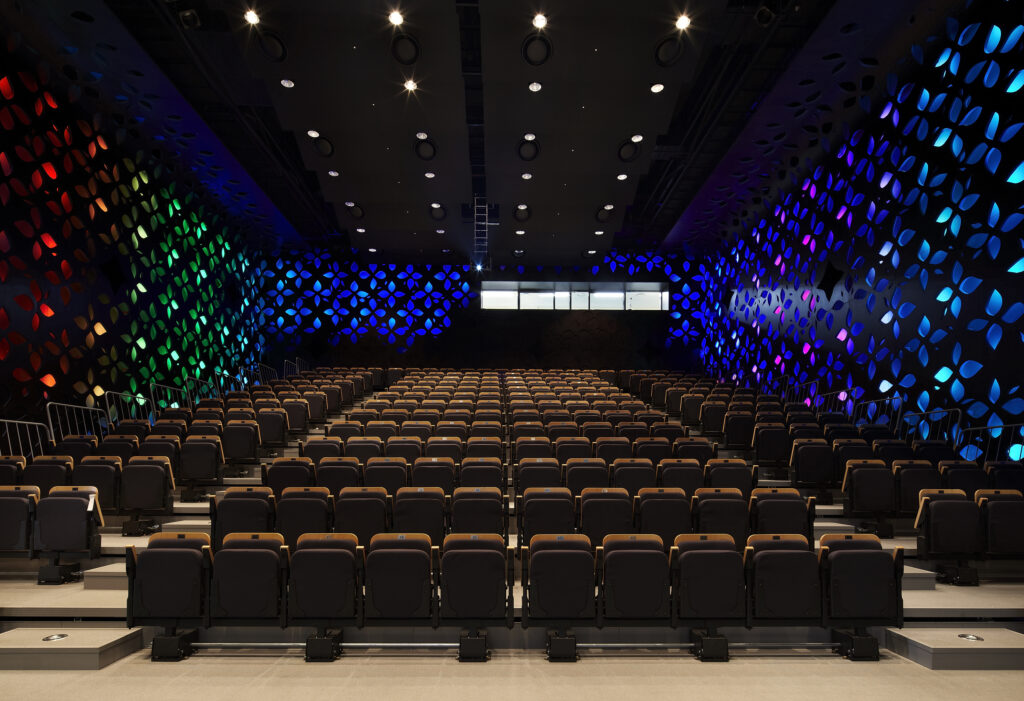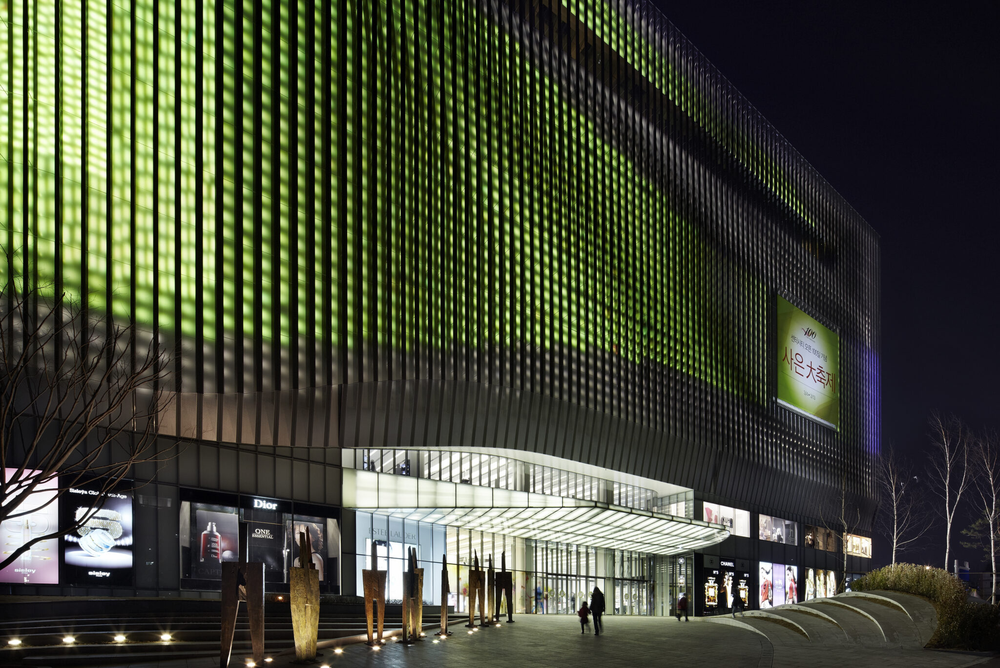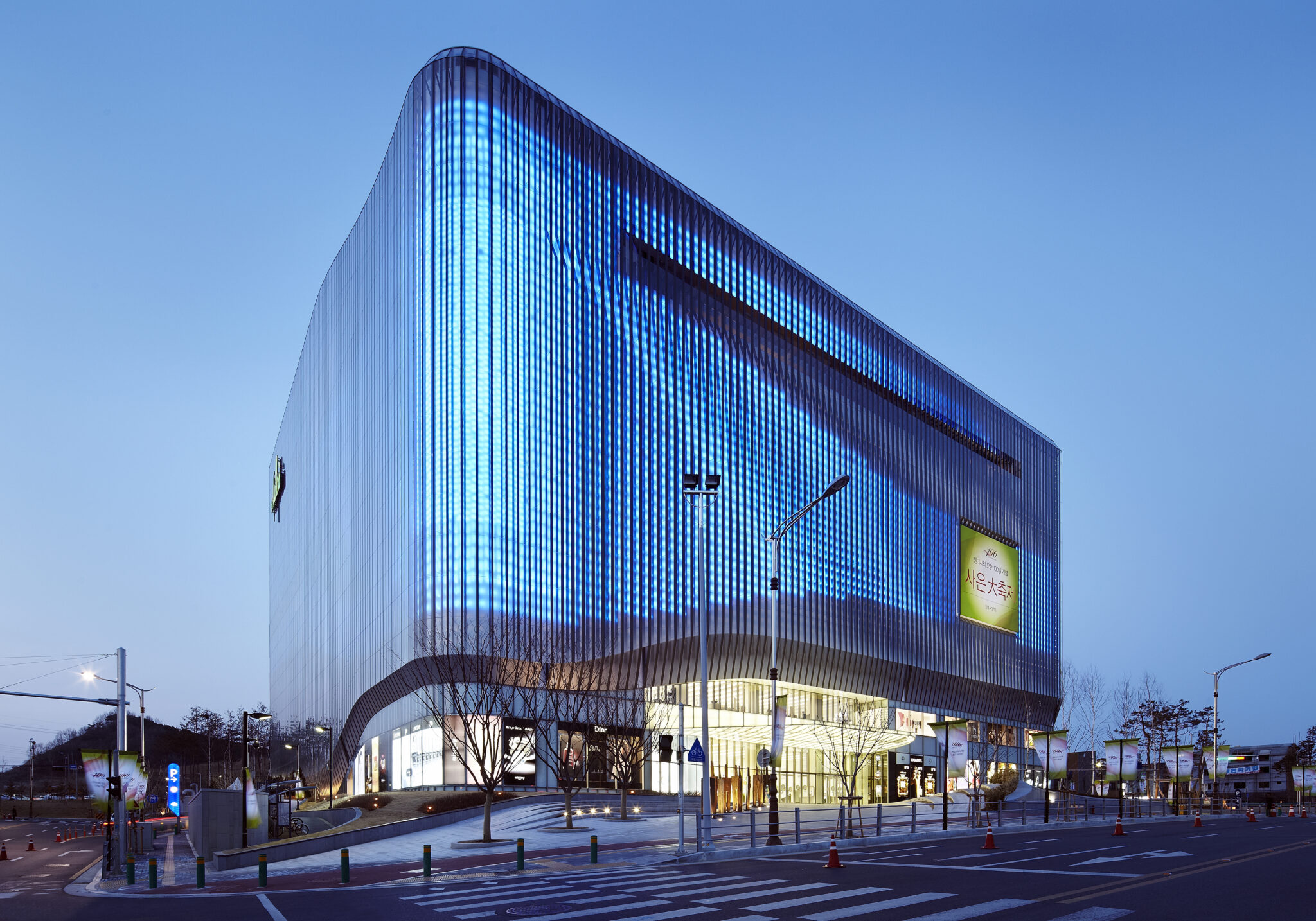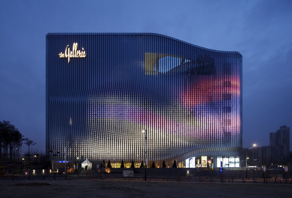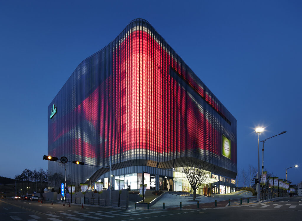 Das Einkaufszentrum Galleria Centercity in Cheonan hat eine medial bespielte Fassade mit einer Fläche von 12.600 qm. Über 22.000 LED-Lichtpunkte verleihen dem Bauwerk mittels dynamischer Lichtinszenierungen eine schillernde Hülle, die eindrucksvoll aus dem städtischen Kontext herausragt. Die vom Leuchtenhersteller Zumtobel speziell entwickelten Hochleistungs-LED-Strahler sind so konzipiert, dass sie beinahe unsichtbar in die Fassade integriert sind. Daraus ist schließlich die Grundidee entstanden, das Licht aus den Fassadeprofilen auf die rückwärtige Gebäudeschicht zu projizieren.